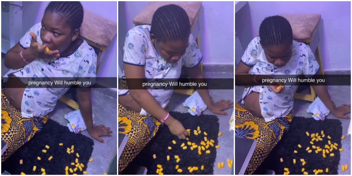 “Pregnancy will humble you” – Pregnant Nigerian woman causes buzz as she eats cheese balls from floor like baby