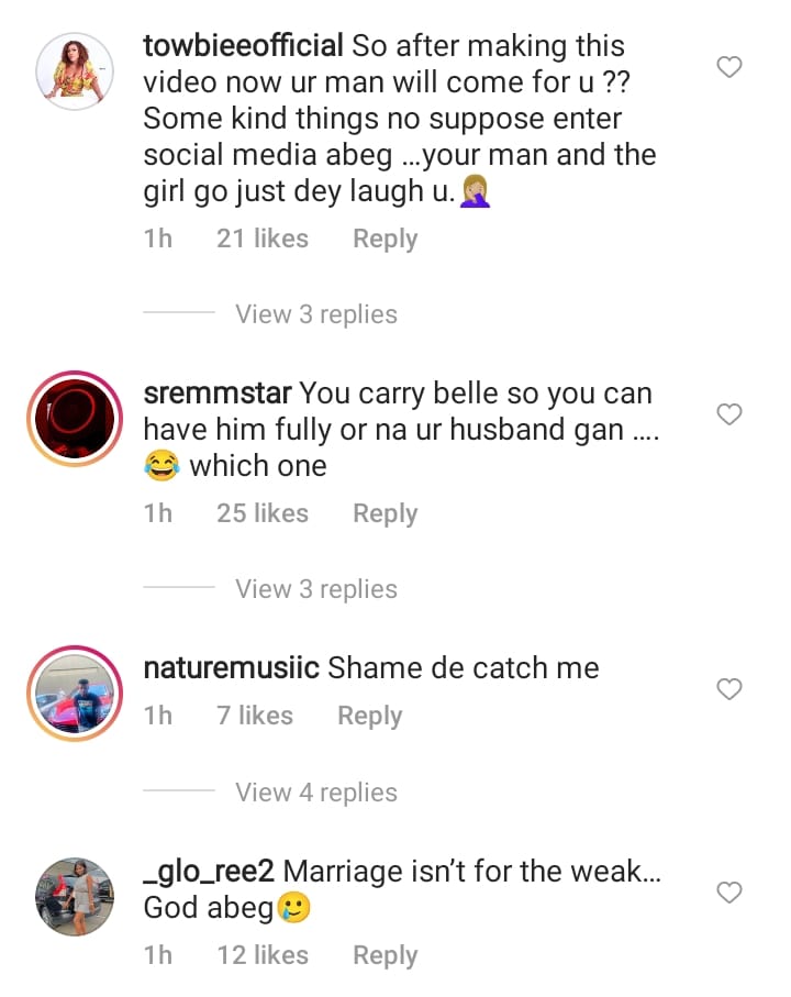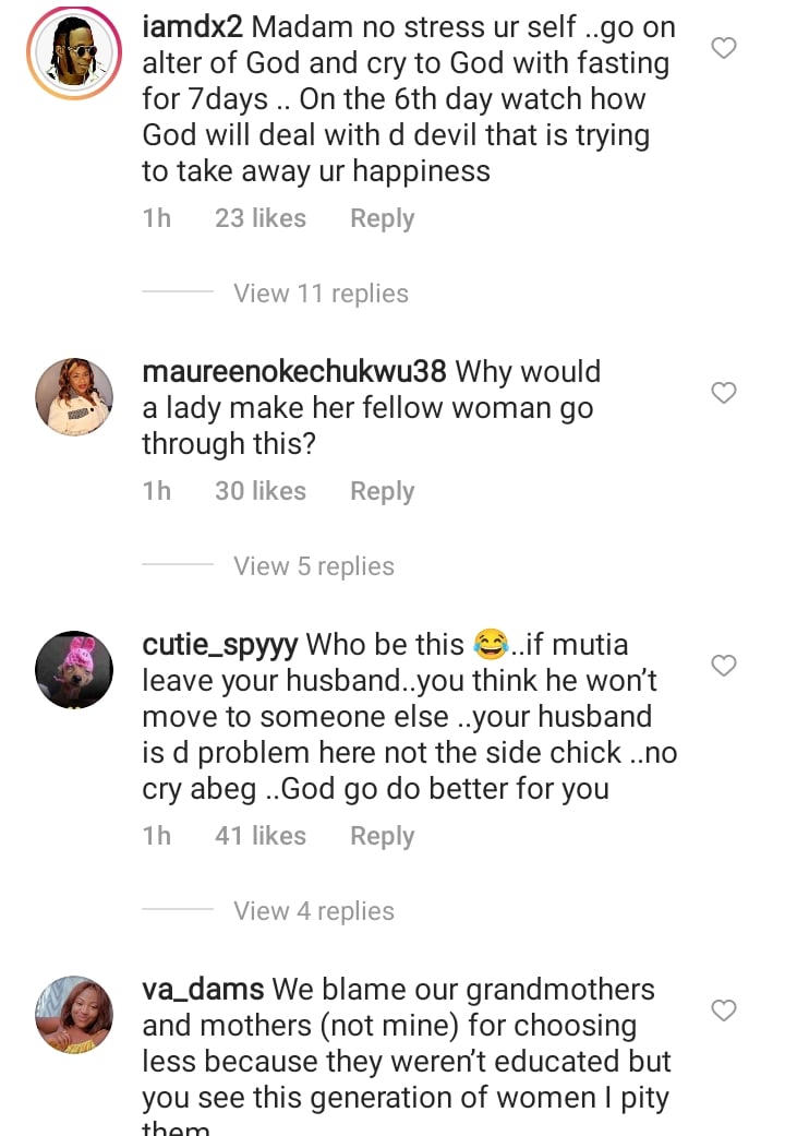 cutie_spyyy wrote: “Who be this mutia leave your husband..you think he won’t move to someone else ..your husband is d problem here not the side chick ..no cry abeg ..God go do better for you”