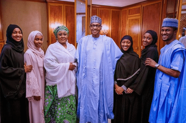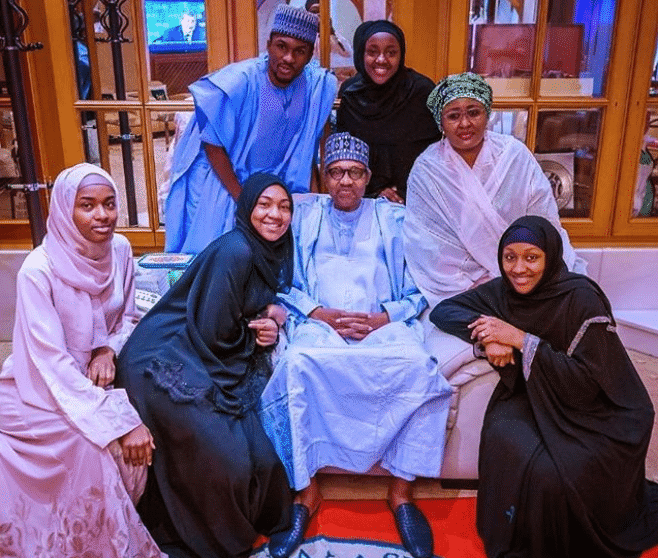 The photo shows Buhari, his wife Aisha, their son Yusuf and their daughters Zahra, Hanan and Halima.