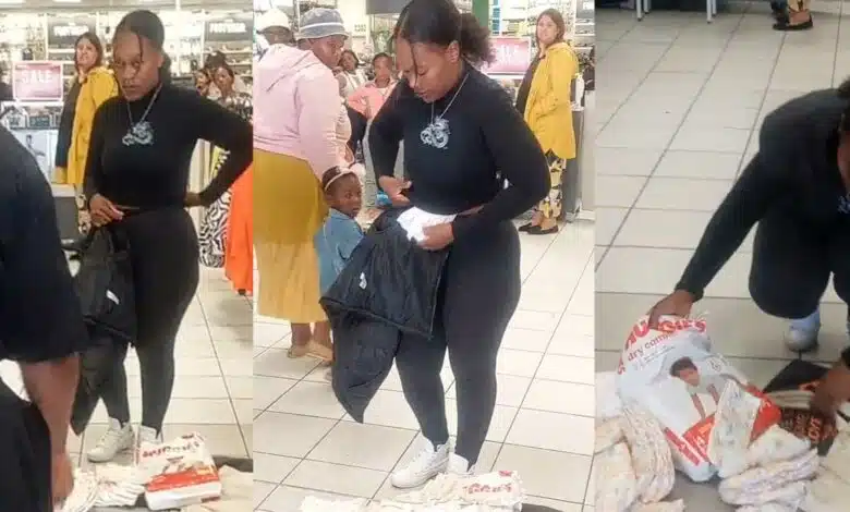 A video which has stirred pity online shows the heartbreaking moment a lady is caught and embarrassed at a supermarket for stealing several packs of baby diapers.