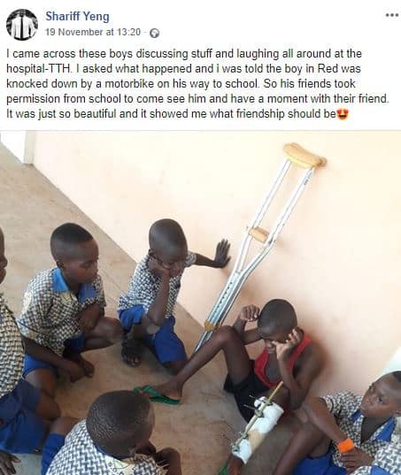 “I came across these boys discussing stuff and laughing all around at the hospital-TTH. I asked what happened and i was told the boy in Red was knocked down by a motorbike on his way to school. So his friends took permission from school to come see him and have a moment with their friend. It was just so beautiful and it showed me what friendship should be?.”