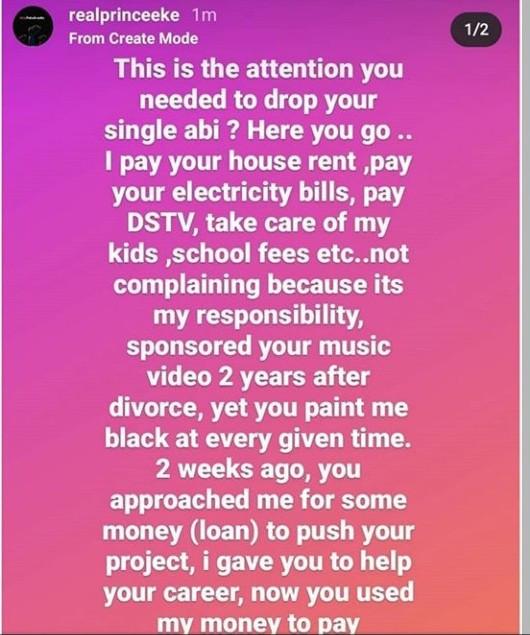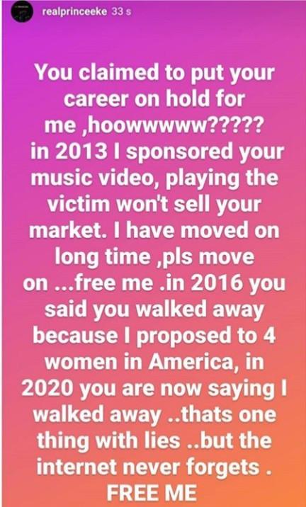 Countering her allegations of putting her music career on hold for three years, Prince Eke stated that he sponsored her career with his money while they were still married and even after 2 years after the dissolution of their marriage.