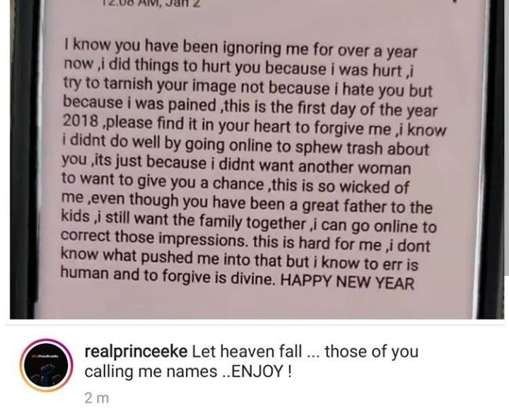 In a series of proofs leaked online by Prince Eke, Muma Gee in an alleged text can be quoted saying, “I didn’t do well by going online to spew trash about you, it’s just because i didn’t want another woman to want to give you a chance, this is so wicked of me.”
