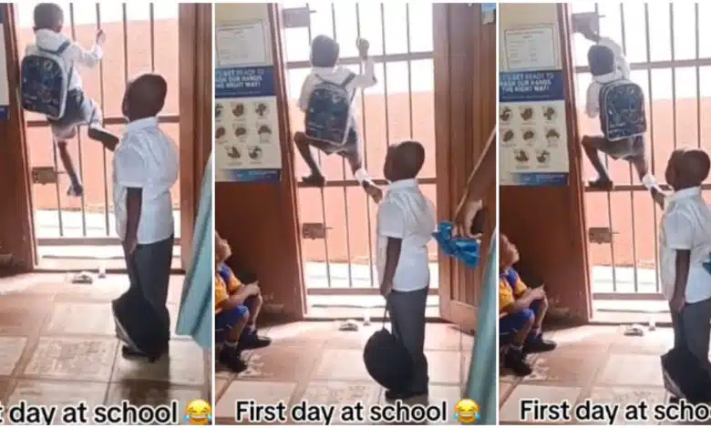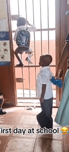 A video of a young school boy attempting to escape from the classroom on his first day of school has taken social media by storm.