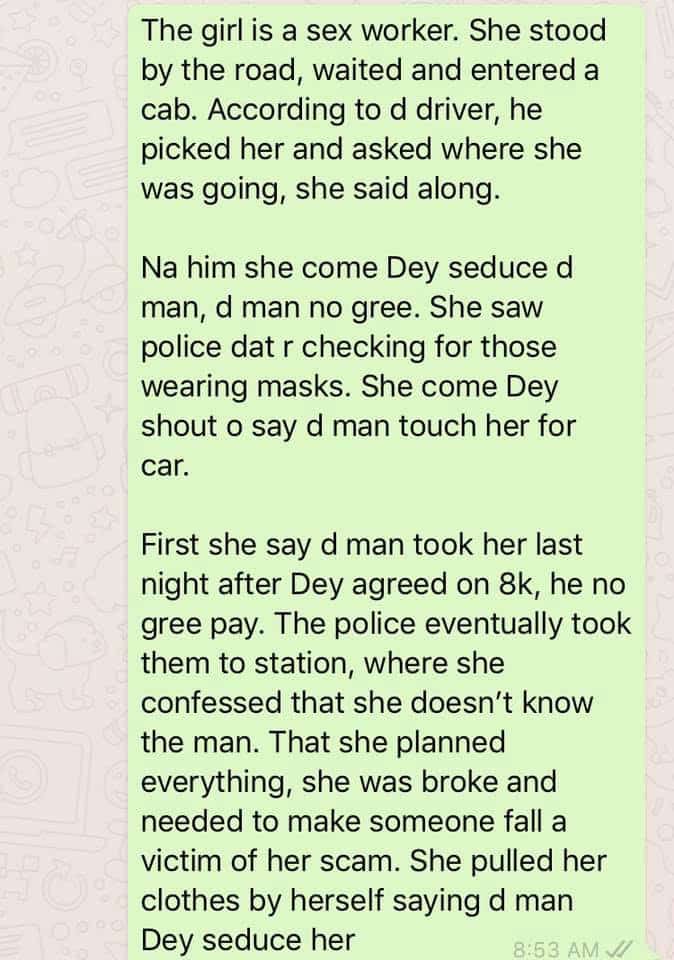 A sex worker who initiated a mild drama in Calabar, Cross River State’s capital allegedly confessed to lying against a cab man who picked her up.