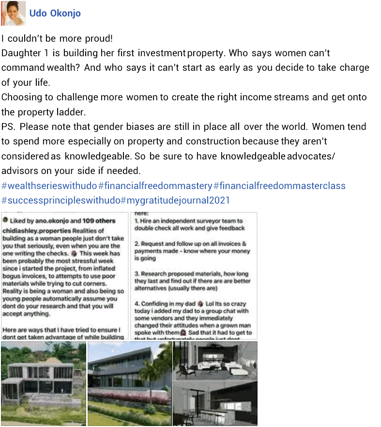 Her proud mother, Mrs Okonjo, took to Facebook to share a glimpse of the house which is still under construction and challenged women to create the right income streams and start investing in Real Estate.