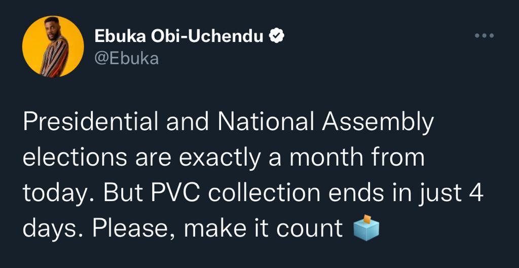 “Presidential and National Assembly elections are exactly a month from today. But the PVC collection ends in just 4 days. Please, make it count”, Ebuka tweeted.