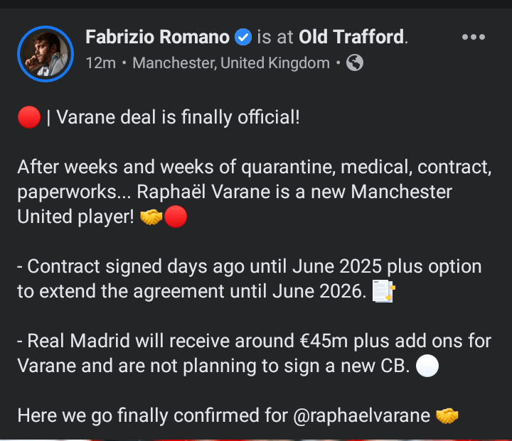 Well, according to influential Italian journalist Fabrizio Romano, the Raphael Varane deal is now official and fully confirmed — he’s a United player! He will wear the no. 19 shirt.
