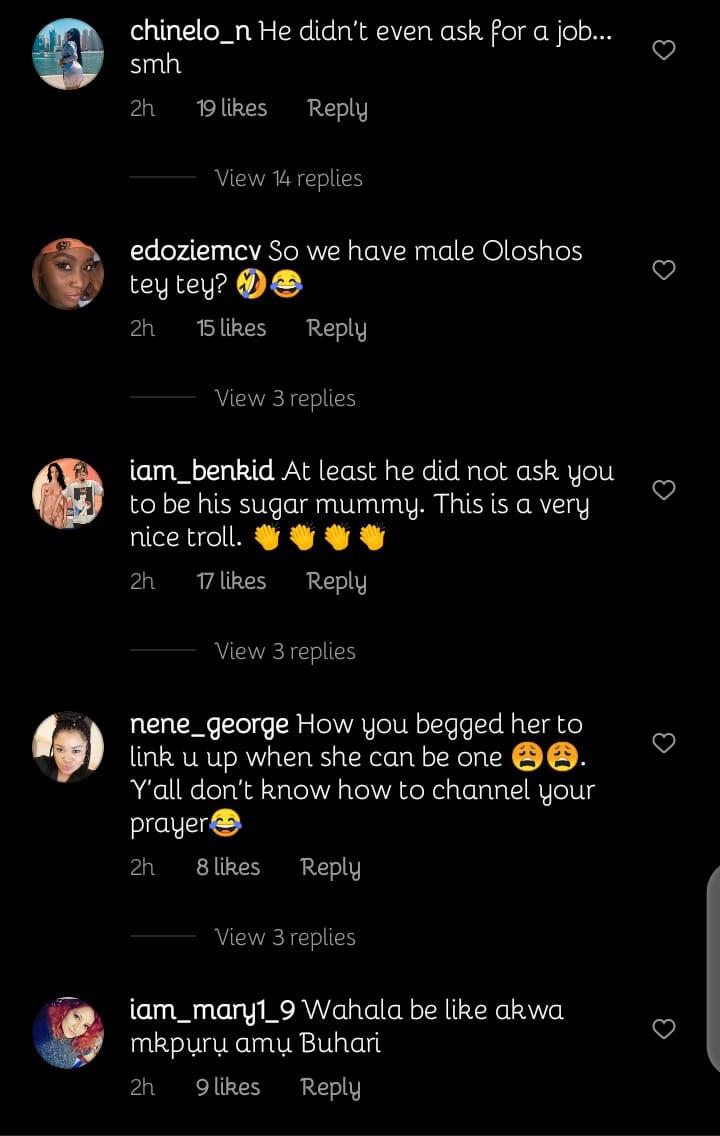 In a screenshot shared by the 49-years-old actress, It revealed that a young man was begging her to link him up with a sugar mummy.