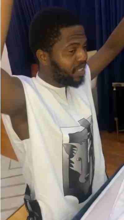 The hilarious clip showed the man kneeling with his hands raised up while the lady questioned him for eating outside despite knowing that she was preparing a meal at home.