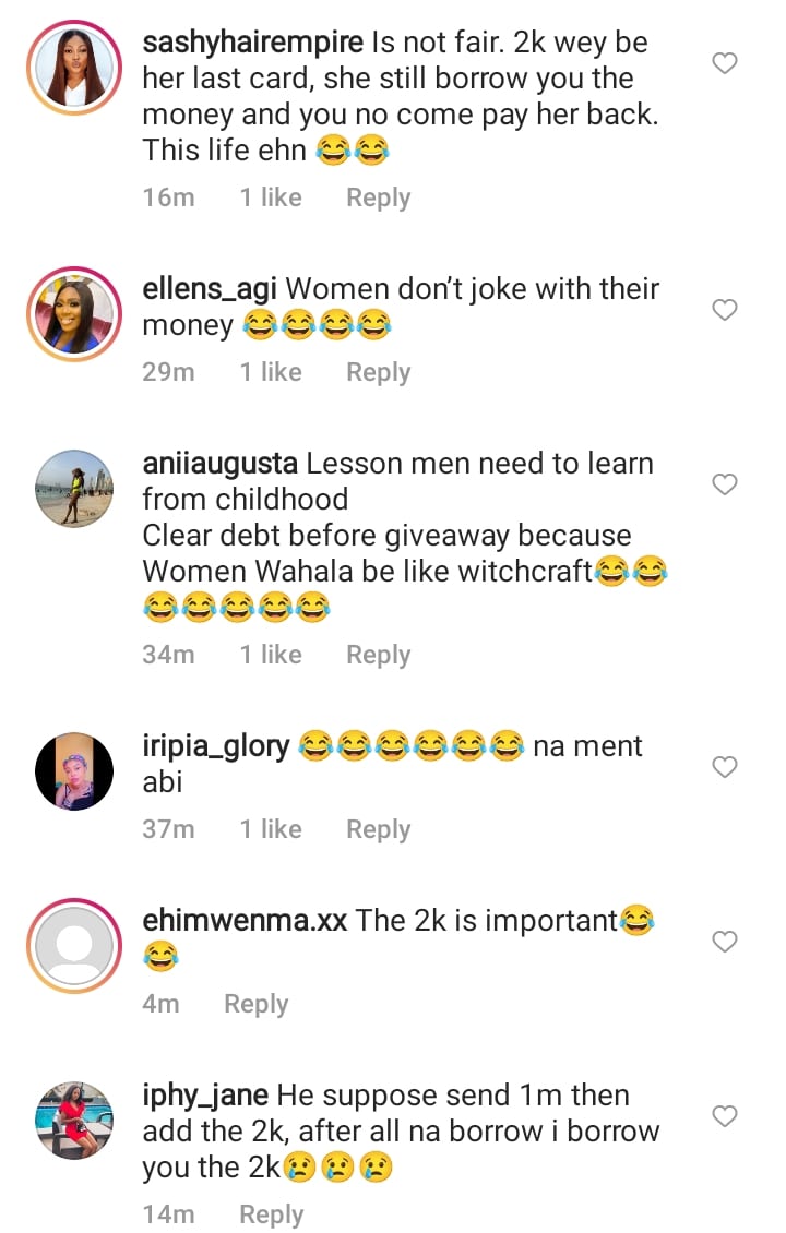 sashyhairempire wrote: “is not fair. 2k wey be her last card, she still borrow you the money and you no come pay her back. This life ehn”
