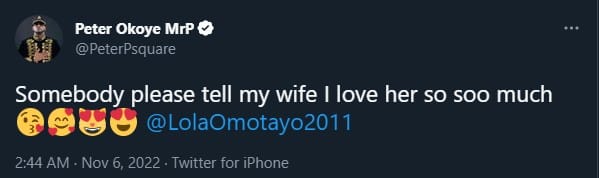 One of the members of the reconciled P-Square band, Peter Okoye, stirs reactions as he pleads to netizens to pass a message to his wife, Lola Omotayo, on his behalf.