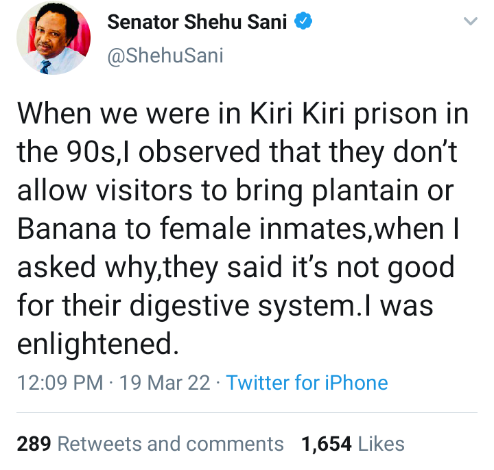 The former senator from Kaduna central recalled that while in the prison in the 90s, he had observed that visitors were not allowed to bring plantain or banana to female inmates on the grounds that they were ‘not good for their digestive system’.