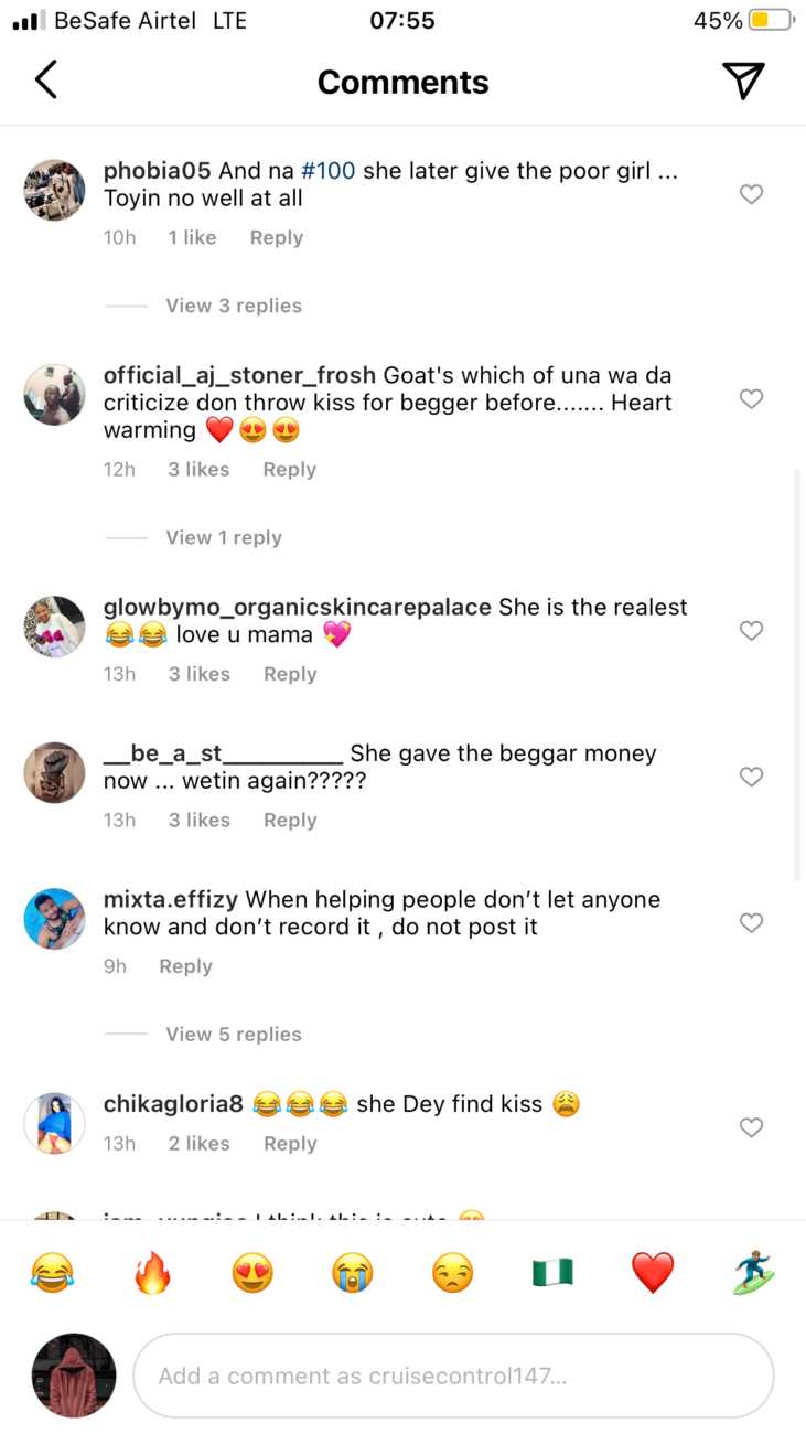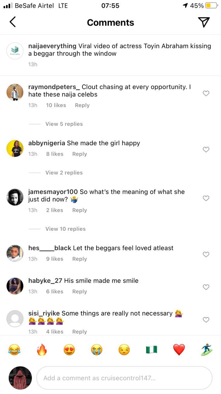 Popular Nollywood actress, Toyin Abraham-Ajeyemi has caused mixed relations among fans after sharing a video of herself blowing a beggar kiss.