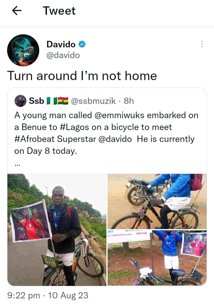 Reactions trail Davido’s harsh response to diehard fan who’s riding bicycle from Benue to Lagos to see him