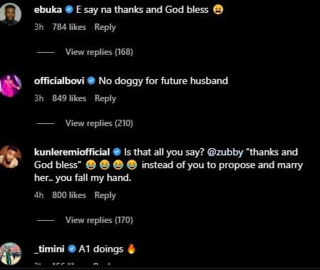 @Kunle Remi wrote: “Is that all you say? @zubby “thanks and God bless” 😂😂😂😂 instead of you to propose and marry her.. you fall my hand.”