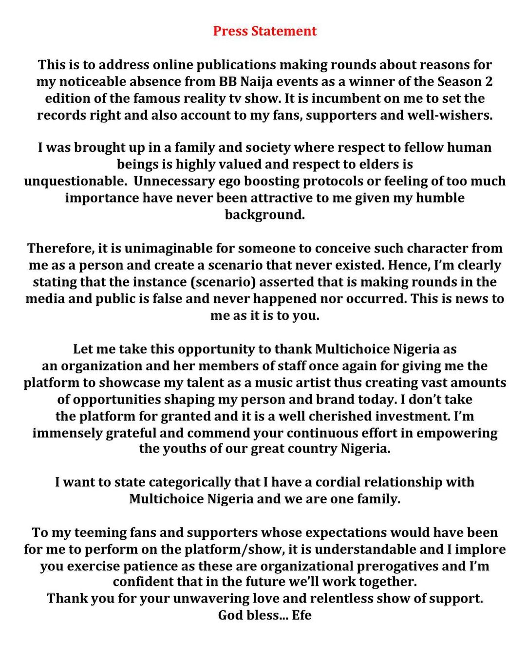 According to the singer in a public statement via his Instagram page, there have been rumours spreading about his reasons for absence, one which Efe took time to clarify in the public statement.