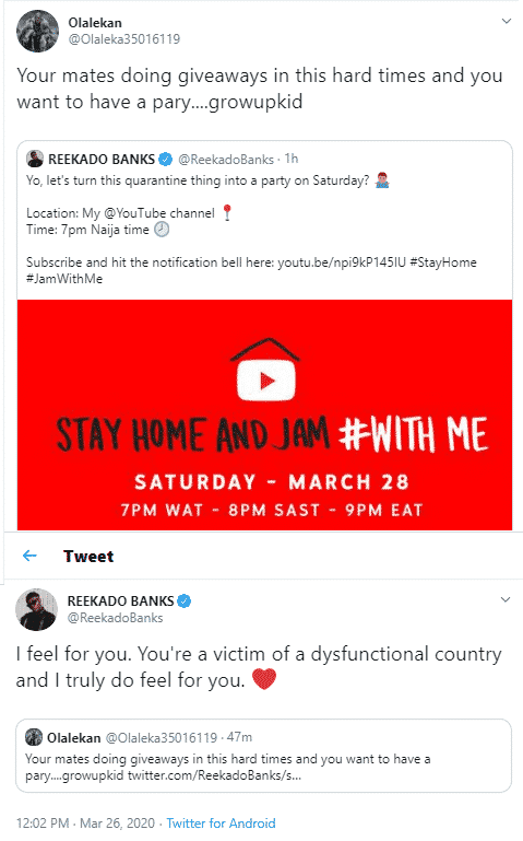 In reply, Reekado wrote: ‘I feel for you. You’re a victim of a dysfunctional country and I truly do feel for you.