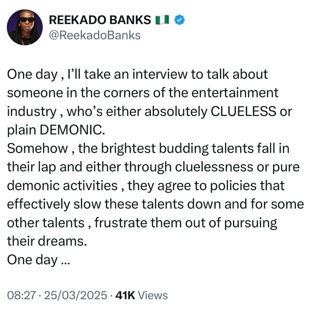 In a post shared on his page on Twitter now called X, Reekado Banks disclosed that he will grant an interview calling out some entertainment players whom he tagged as “demonic”.