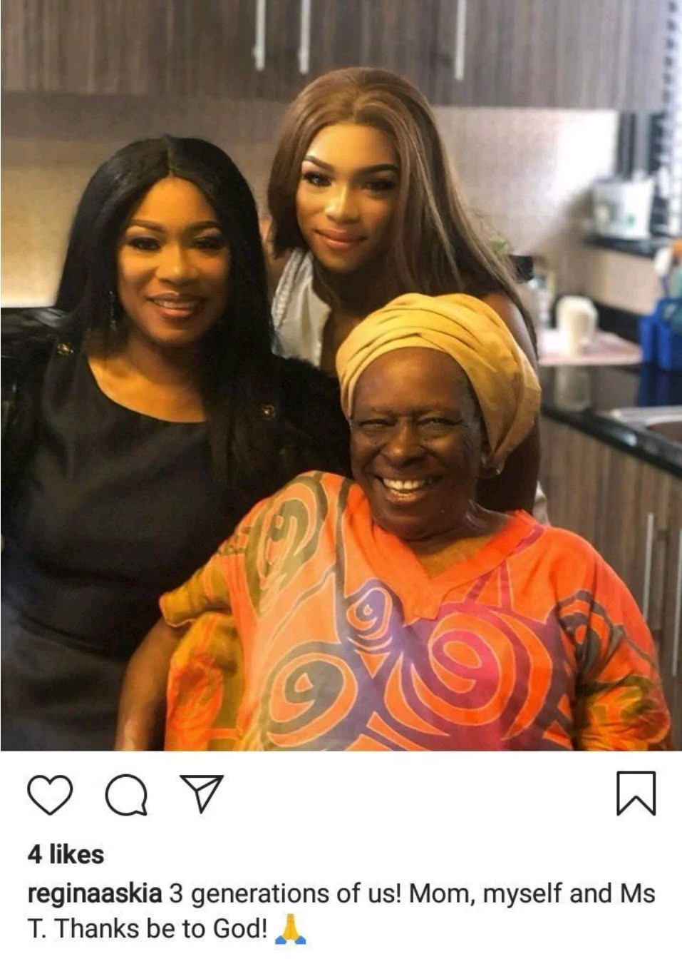 Veteran Nollywood actress, Regina Askia has shared a very adorable photo of herself, her mother and her daughter in one photo.