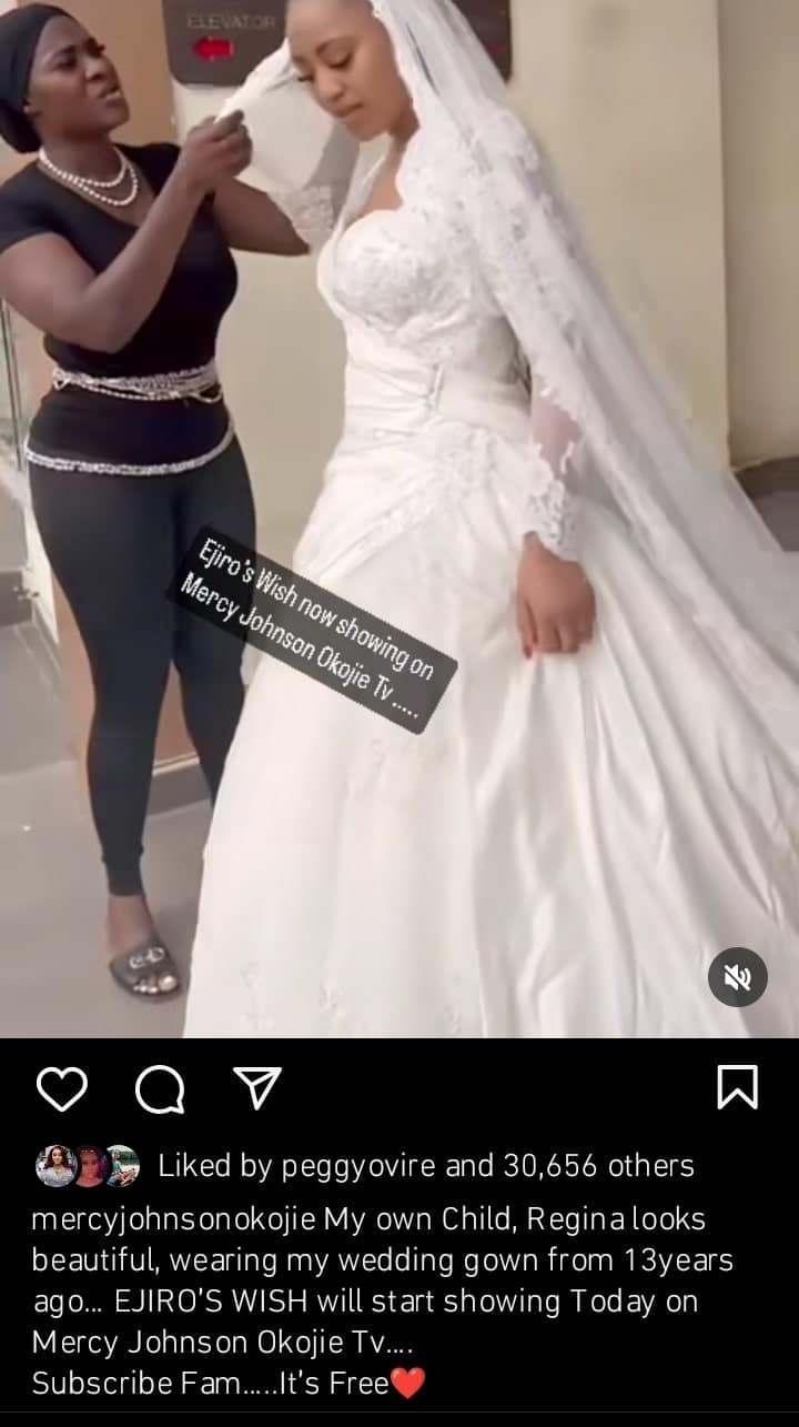Mercy, who recently cast Regina in her project, shared a heartwarming video of her helping the mother of two into her wedding gown – the same one she wore 13 years ago