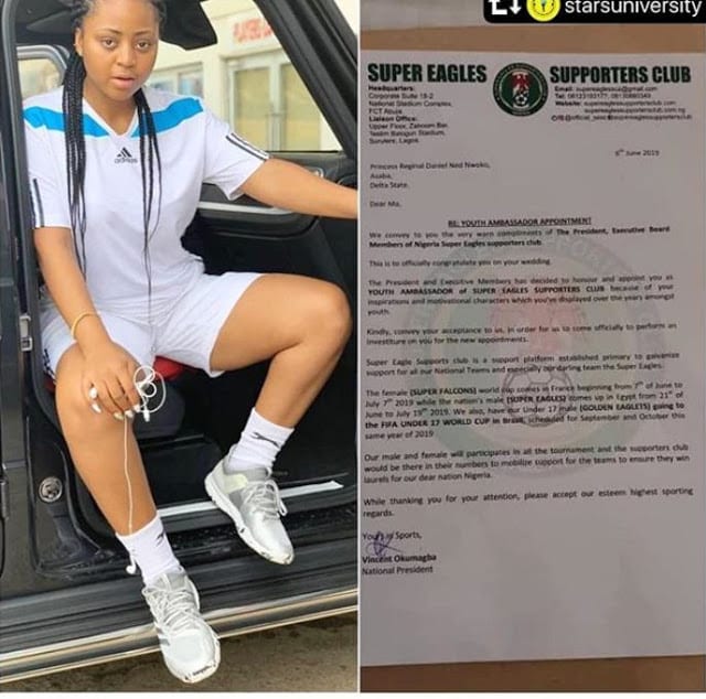 Daniels has been appointed as a youth ambassador of the Super Eagles supporters club in consideration of her motivational endeavors and passion shown over the course of the years.