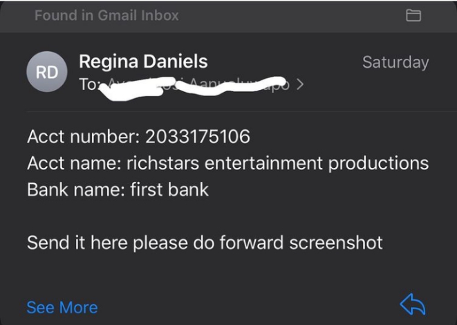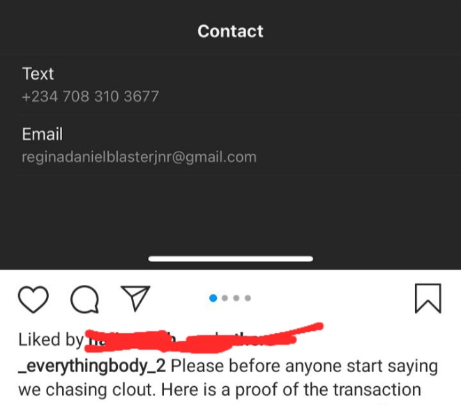 In a bid to confirm transaction with the mother of one, the owner of ‘everythingbody’ shared business contacts of Regina which she allegedly used to contact her for the deal.