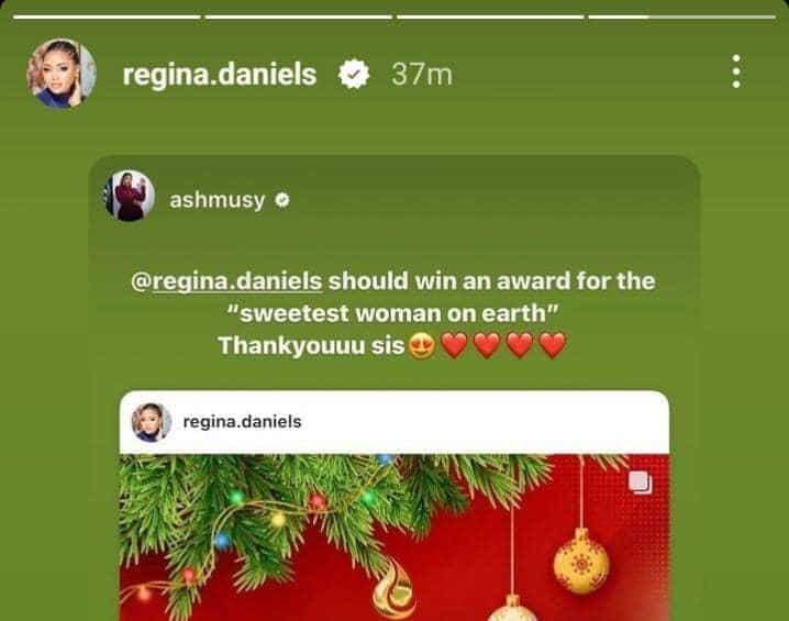 She wrote; “@regina.daniels should win an award for the “sweetest woman on earth”. Thankyouuu sis.”