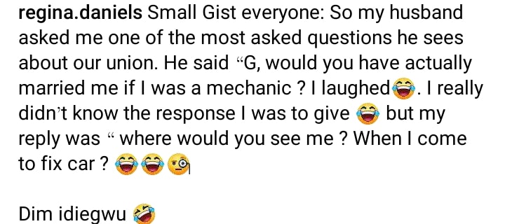 “Small Gist everyone: So my husband asked me one of the most asked questions he sees about our union. He said “G, would you have actually married me if I was a mechanic ? I laughed. I really didn’t know the response I was to give but my reply was “ where would you see me ? When I come to fix car?
