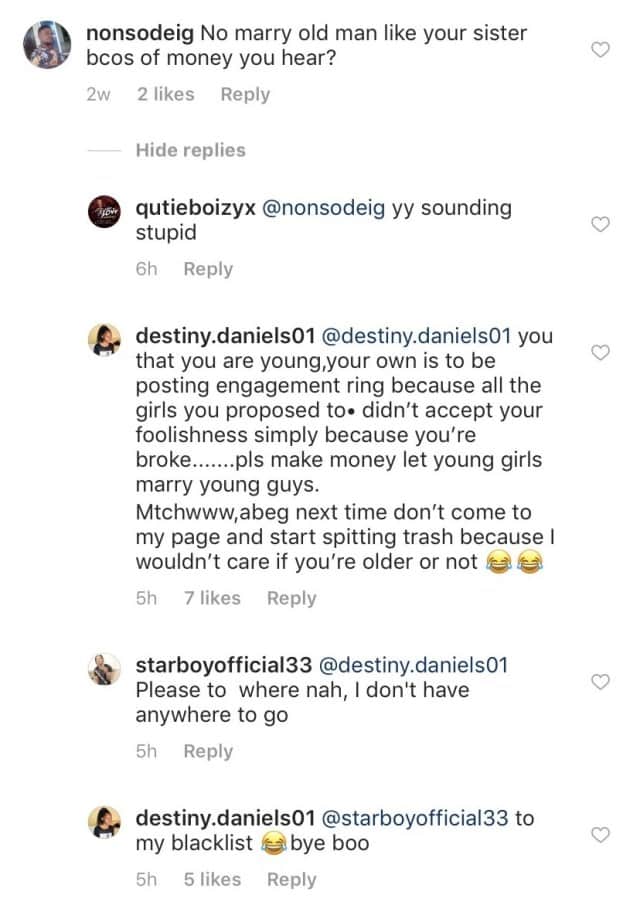 “you that you are young,your own is to be posting engagement ring because all the girls you proposed to didn’t accept your foolishness simply because you’re broke…….pls make money let young girls marry young guys. Mtchwww,abeg next time don’t come to my page and start spitting trash because I wouldn’t care if you’re older or not.”