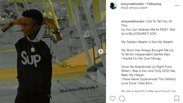 According to Emzy who recently graduated from the University of Port Harcourt, Nwoko is a deadbeat dad who has never provided for him. Emzy stated that he was abandoned for his mother who has since been taking care of him.