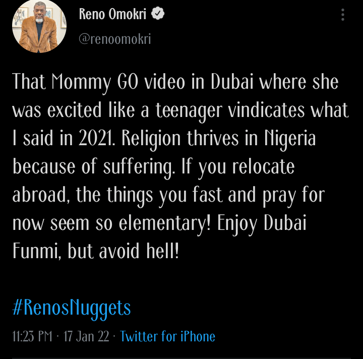 “That Mommy GO video in Dubai where she was excited like a teenager vindicates what I said in 2021. Religion thrives in Nigeria because of suffering. If you relocate abroad, the things you fast and pray for now seem so elementary! Enjoy Dubai Funmi, but avoid hell!