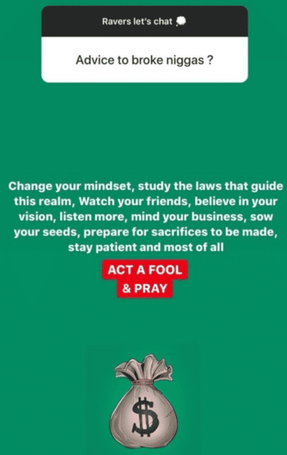 “Change your mindset, change the laws that guide this realm, Watch your friends, believe in your vision, listen more, mind your business, sow your seeds, prepare for sacrifices to be made, stay patient, and most of all, act a fool and pray.”