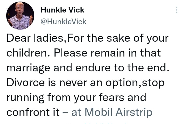According to tweep identified as Hunkle Vic, women shouldn’t think of breaking ties with their husbands when things get bad.