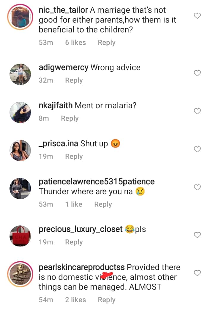 He wrote: “Dear ladies,For the sake of your children. Please remain in that marriage and endure to the end. Divorce is never an option,stop running from your fears and confront it”