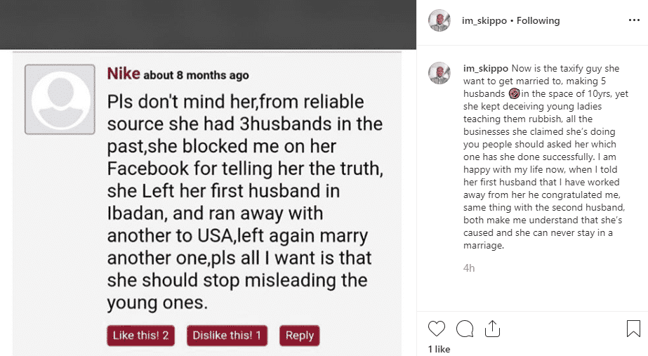 This is the reason why I work away and I refused to say anything, but I kept hearing different lies against me and my family, I decided to voice out. Why must you lied about everything? After the wedding you said I am broke that I don’t have money and you want to move on. You told me you have seen another man I should let you go. Why would I feel pains, when I know the pains I went through for the few months I spent with you. You kept wasting resources, investing on a wrong direction and you are complaining you are financially down. Sleeping with the taxify guy in different hotels with another man pregnancy, yet you are still claiming you are right bcoz is the house you rented for you and your kids. I thank God for my life.
