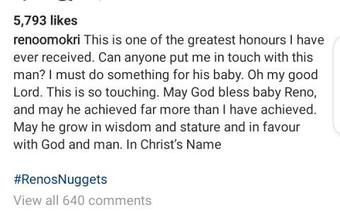 “This is one of the greatest honors I have ever received. Can anyone put me in touch with this man? I must do something for his baby. Oh my good Lord. This is so touching. May God bless baby Reno, and may be achieved far more than I have achieved. May he grow in wisdom and stature and in favor with God and man. In Christ’s Name”.