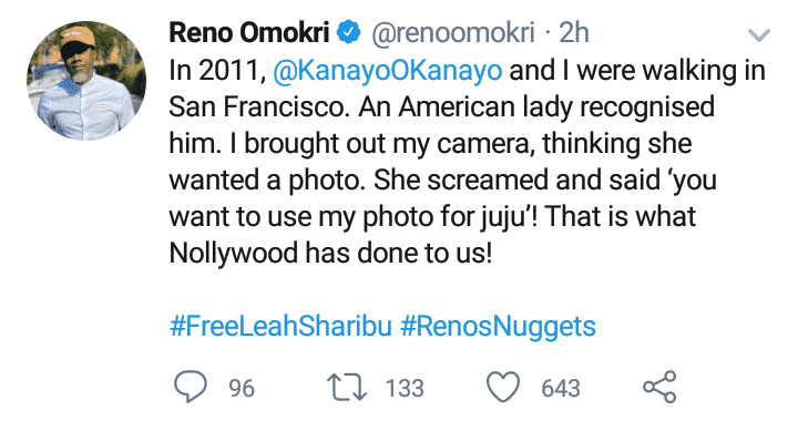 In a followup tweet, Reno also shared an experience he had while walking in San Francisco with Kanayo O. Kanayo.