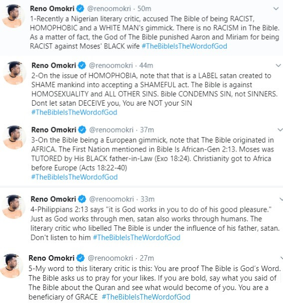 Reacting to Ikhide’s post, Reno via his Twitter handle, said the literary critic is under the influence of his father, Satan. According to Omokri, Ikhide should say the same things he said about the bible, about the Quaran and see what happens to him.