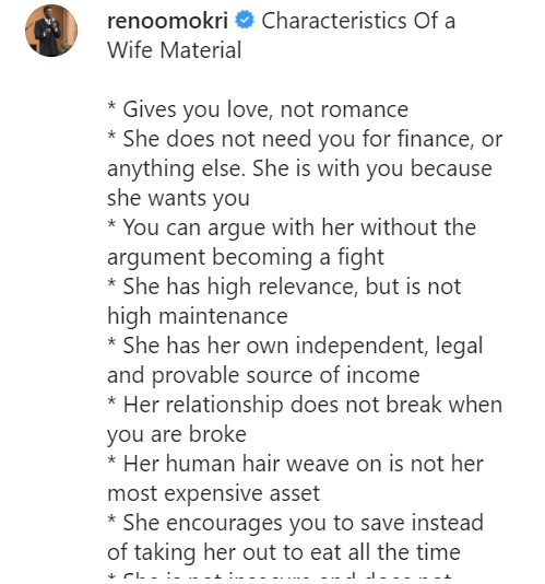 Human rights activist, Reno Omokri takes time out to list what he believes to be the characteristics of a good wife material.