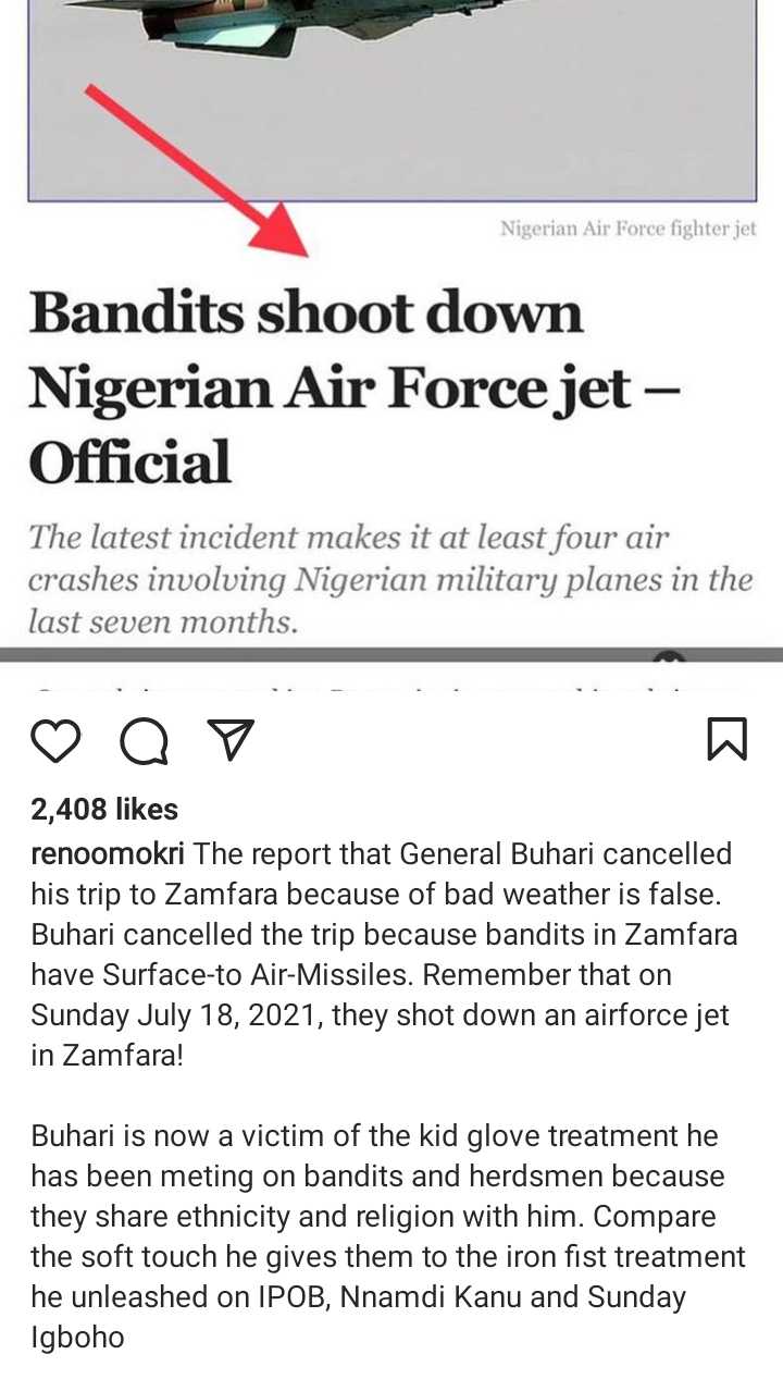“Buhari cancelled the trip because bandits in Zamfara have Surface-to Air-Missiles. Remember that on Sunday, July 18, 2021, they shot down an airforce jet in Zamfara!