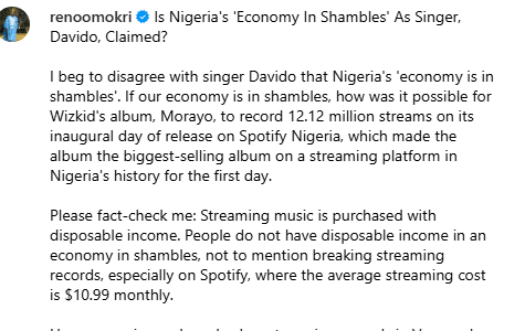 Political commentator, Reno Omokri reacts to Davido’s recent statement in a podcast where he had mentioned that the country’s economy is in shambles.
