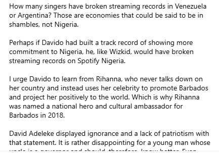 I urge Davido to learn from Rihanna, who never talks down on her country and instead uses her celebrity to promote Barbados and project her positively to the world. Which is why Rihanna was named a national hero and cultural ambassador for Barbados in 2018.