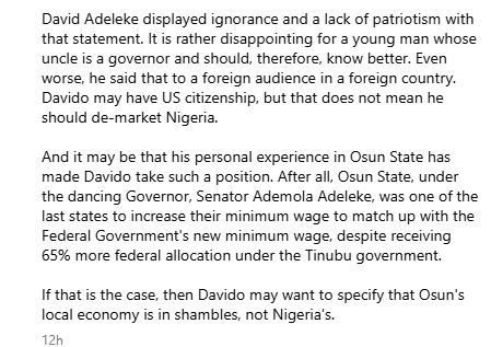 David Adeleke displayed ignorance and a lack of patriotism with that statement. It is rather disappointing for a young man whose uncle is a governor and should, therefore, know better. Even worse, he said that to a foreign audience in a foreign country. Davido may have US citizenship, but that does not mean he should de-market Nigeria.