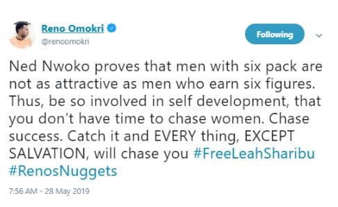 “Ned Nwoko proves that men with six pack are not as attractive as men who earn six figures. Thus, be so involved in self development, that you don’t have time to chase women. Chase success. Catch it and EVERY thing, EXCEPT SALVATION, will chase you #FreeLeahSharibu #RenosNuggets”