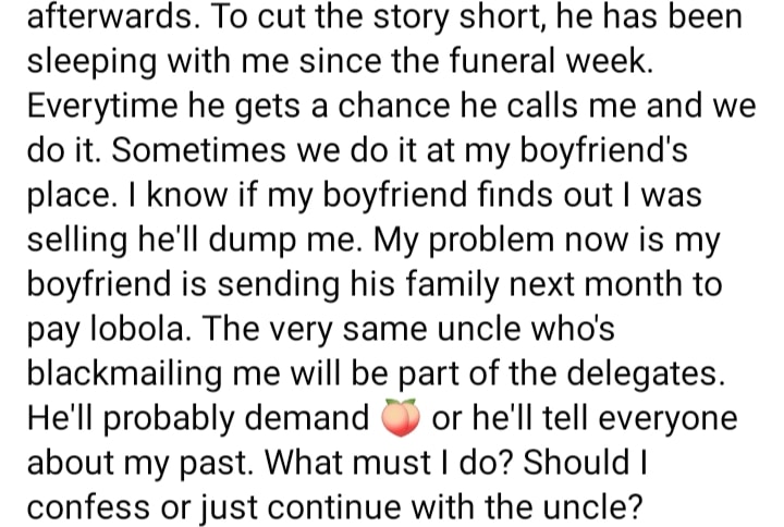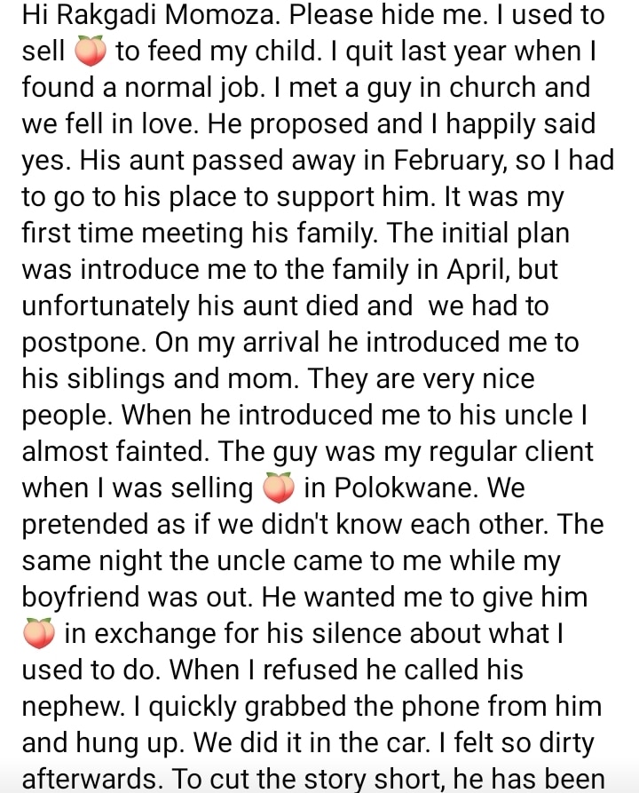 “Hi Rakgadi Momoza. Please hide me. I used to sell 🍑 to feed my child. I quit last year when I found a normal job. I met a guy in church and we fell in love. He proposed and I happily said yes. His aunt passed away in February, so I had to go to his place to support him. It was my first time meeting his family. The initial plan was introduce me to the family in April, but unfortunately his aunt died and we had to postpone. On my arrival he introduced me to his siblings and mom. They are very nice people. When he introduced me to his uncle I almost fainted. The guy was my regular client when I was selling 🍑 in Polokwane. We pretended as if we didn’t know each other. The same night the uncle came to me while my boyfriend was out. He wanted me to give him 🍑 in exchange for his silence about what I used to do. When I refused he called his nephew. I quickly grabbed the phone from him and hung up. We did it in the car. I felt so dirty afterwards. To cut the story short, he has been sleeping with me since the funeral week. Everytime he gets a chance he calls me and we do it. Sometimes we do it at my boyfriend’s place. I know if my boyfriend finds out I was selling he’ll dump me. My problem now is my boyfriend is sending his family next month to pay lobola. The very same uncle who’s blackmailing me will be part of the delegates. He’ll probably demand 🍑 or he’ll tell everyone about my past. What must I do? Should I confess or just continue with the uncle?”