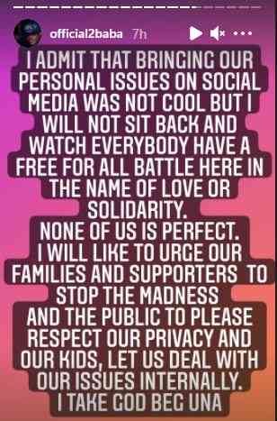 “I admit that bringing our personal issues on social media was not cool but I will not sit back and watch everybody have a free for all battle here in the name of love or solidarity. None of us is perfect. I will like to urge our families and supporters to stop the madness and the public to please respect our privacy and our kids, let us deal with our issues internally. I take god beg una.”