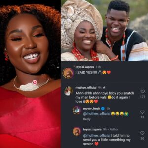 Reacting to the couple’s photoshoot, Rhuthee took to the comment section and commented, “Ahhh ahhh ahhh Toyo baby you snatched my man before vals. Do it again I love it”.