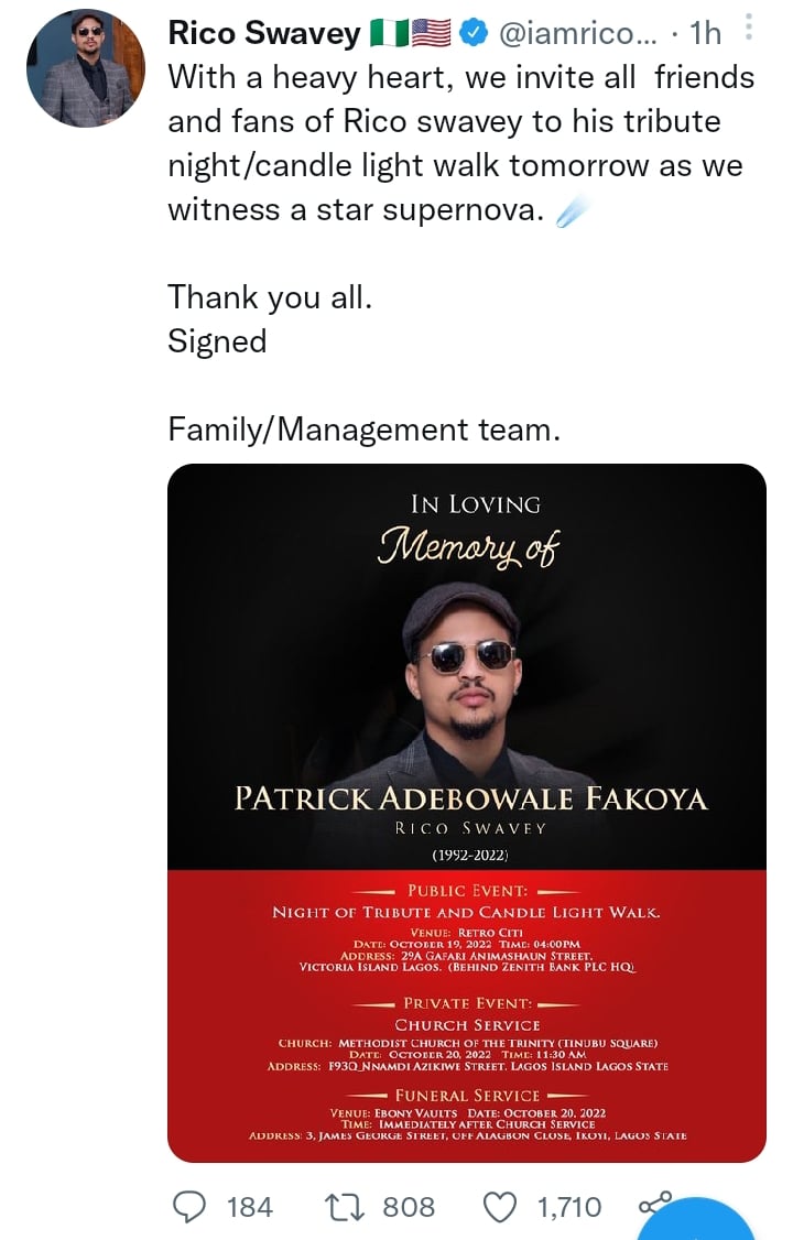 “With a heavy heart, we invite all friends and fans of Rico swavey to his tribute night/candle light walk tomorrow as we witness a star supernova. Thank you all. Signed Family/Management team”