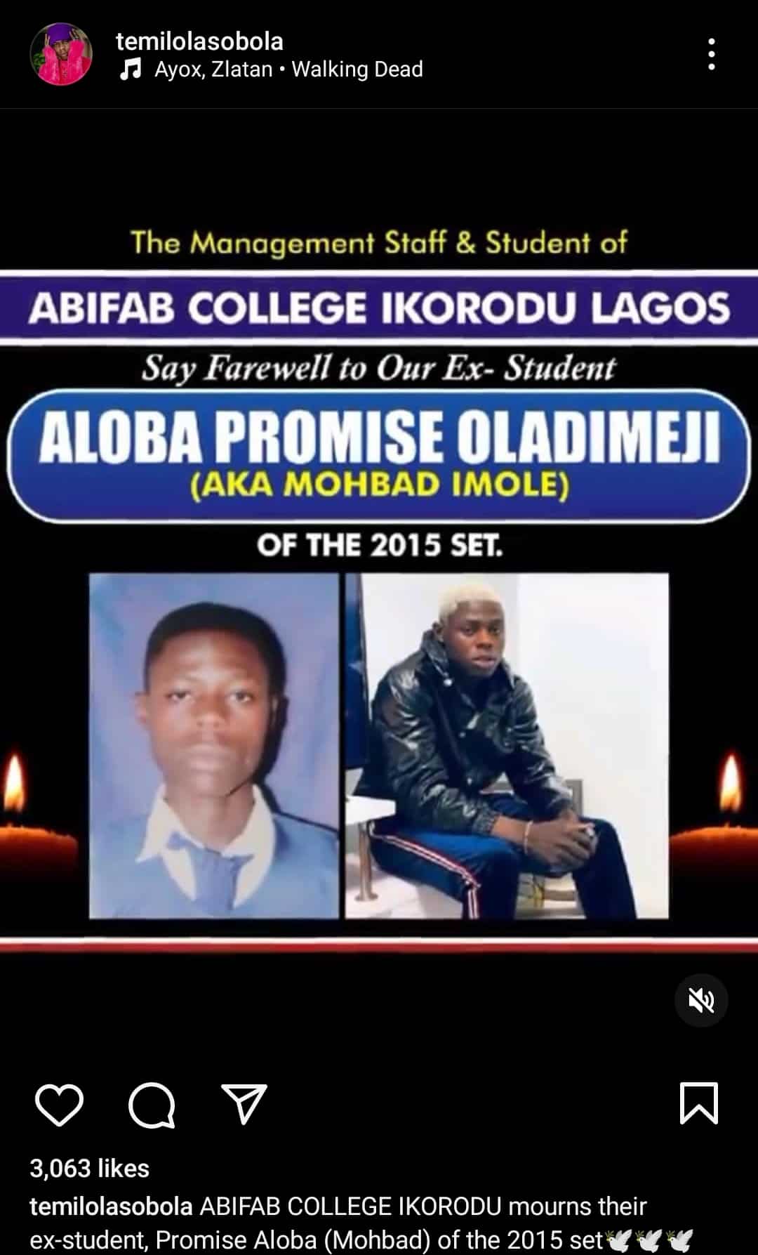 “RIP general mohbad” – Tears as Abifab College mourns their ex-student, Promise Aloba, aka Mohbad of 2015 set